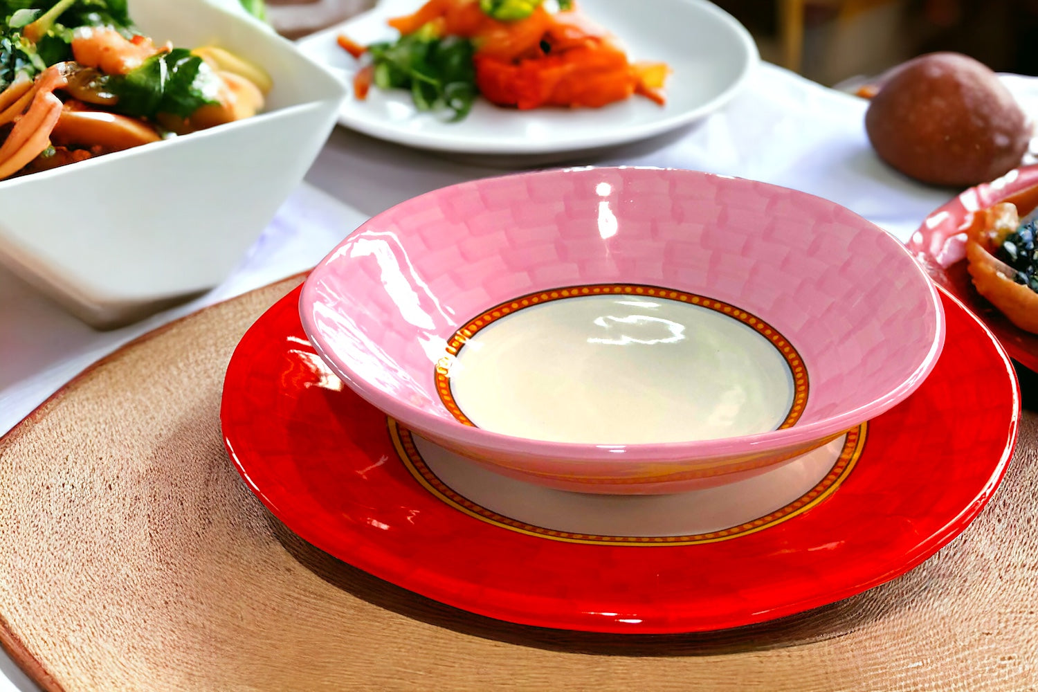 The "Colori" irregular shape collection by Geribi Ceramics, appears to showcase a vivid and vibrant selection of ceramics. The collection seems to emphasize a variety of hues, as evidenced by the plates in the foreground and background.
