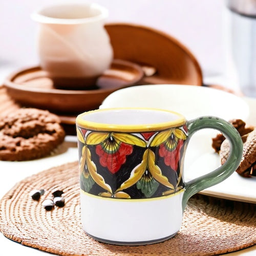 这款 Geribi Deruta 马克杯完美地融合了实用性和艺术性,其装饰图案与孔雀羽毛的优雅相呼应。柔和的蓝色优雅地过渡到更深的色调,营造出一种深度和动感。黑色轮廓突出了设计,为羽毛般的图案增添了优雅的色彩。浓郁的绿色手柄与凉爽的蓝色色调相得益彰,握感舒适,让您可以享受自己喜欢的热饮。这款马克杯不仅仅是一个饮具;它是一件意大利工艺品,为每一次啜饮带来一丝优雅。