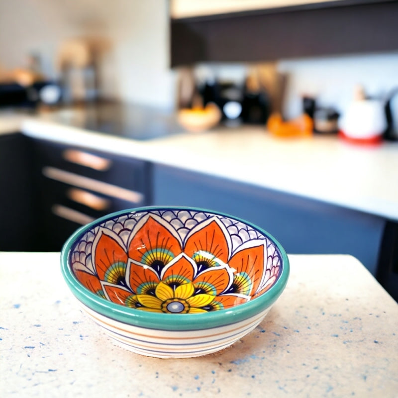 厨房台面上摆放着一个色彩鲜艳的 Geribi Deruta 碗,上面装饰着醒目的橙色和紫色花卉图案。它的色彩令人赏心悦目,与厨房内部现代而柔和的色调形成鲜明对比。碗的设计采用对称的花卉图案,为现代空间增添了诱人的传统气息和温暖感。它似乎随时可以装满新鲜水果或作为中心装饰,为日常环境带来意大利式优雅。