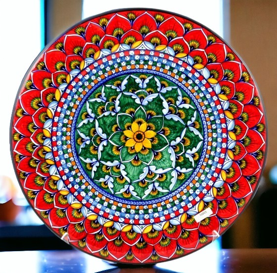 这款色彩鲜艳的手绘墙盘是意大利德鲁塔的 Geribi Studio 作品的典范。它采用郁郁葱葱的花卉图案,花瓣层层叠叠,呈鲜艳的红色和绿色,中间是一朵金黄色的花朵。复杂的图案让人联想到盛开的菊花,象征着完美和乐观。每一笔都体现了对传统工艺的承诺,将意大利艺术的乐趣带入任何空间。这块盘子不仅是一个实用物品,更是一件颂扬手工传统之美的艺术品。