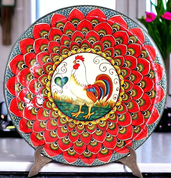 这款色彩鲜艳的手绘墙盘是意大利德鲁塔的 Geribi Studio 作品的典范。它采用郁郁葱葱的花卉图案,花瓣层层叠叠,呈鲜艳的红色和绿色,中间是一朵金黄色的花朵。复杂的图案让人联想到盛开的菊花,象征着完美和乐观。每一笔都体现了对传统工艺的承诺,将意大利艺术的乐趣带入任何空间。这块盘子不仅是一个实用物品,更是一件颂扬手工传统之美的艺术品。
