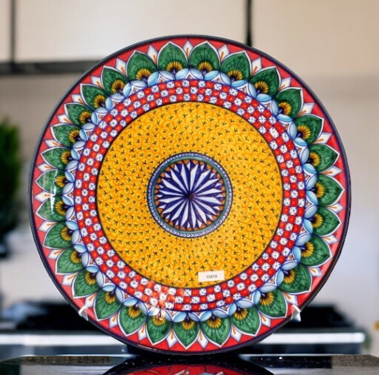 这款色彩鲜艳的手绘墙盘是意大利德鲁塔的 Geribi Studio 作品的典范。它采用郁郁葱葱的花卉图案,花瓣层层叠叠,呈鲜艳的红色和绿色,中间是一朵金黄色的花朵。复杂的图案让人联想到盛开的菊花,象征着完美和乐观。每一笔都体现了对传统工艺的承诺,将意大利艺术的乐趣带入任何空间。这块盘子不仅是一个实用物品,更是一件颂扬手工传统之美的艺术品。