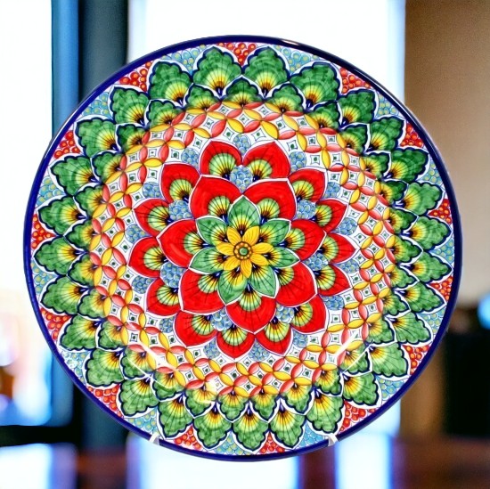 这款色彩鲜艳的手绘墙盘是意大利德鲁塔的 Geribi Studio 作品的典范。它采用郁郁葱葱的花卉图案,花瓣层层叠叠,呈鲜艳的红色和绿色,中间是一朵金黄色的花朵。复杂的图案让人联想到盛开的菊花,象征着完美和乐观。每一笔都体现了对传统工艺的承诺,将意大利艺术的乐趣带入任何空间。这块盘子不仅是一个实用物品,更是一件颂扬手工传统之美的艺术品。