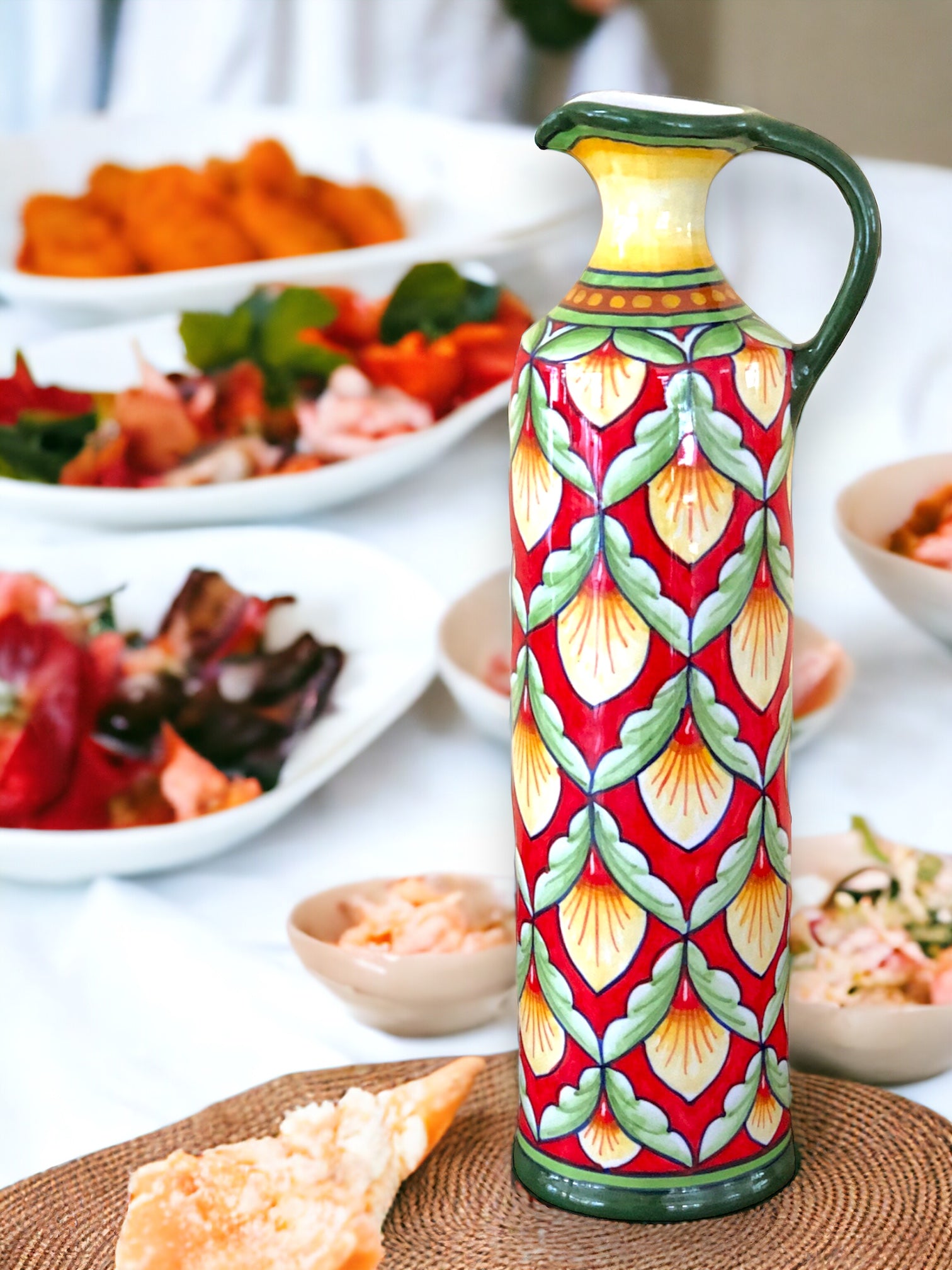 这个色彩鲜艳的油瓶是一件令人惊叹的作品,立刻吸引了人们的眼球。它是 Geribi 陶瓷的精美代表,展示了 Deruta 艺术家以其精致的手绘设计而闻名。明亮的红色、黄色和绿色的交相辉映营造出温暖的地中海风情,非常适合为任何用餐环境增添一抹色彩。