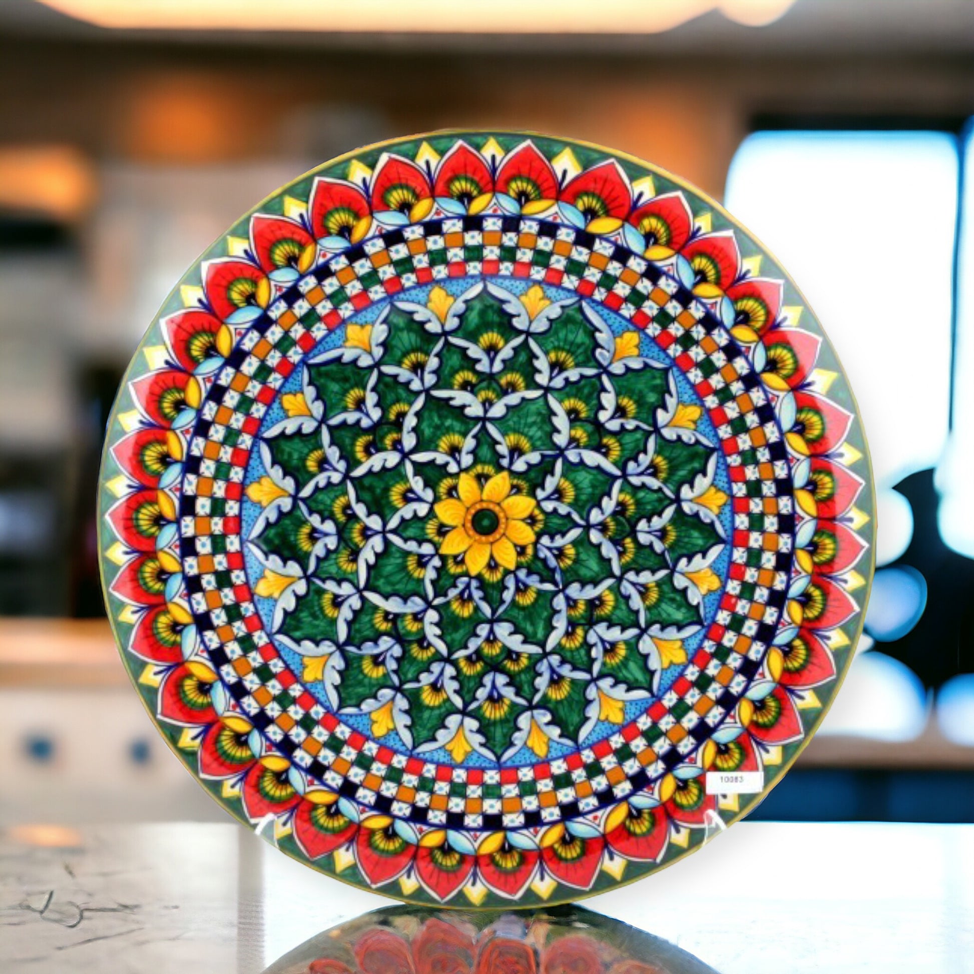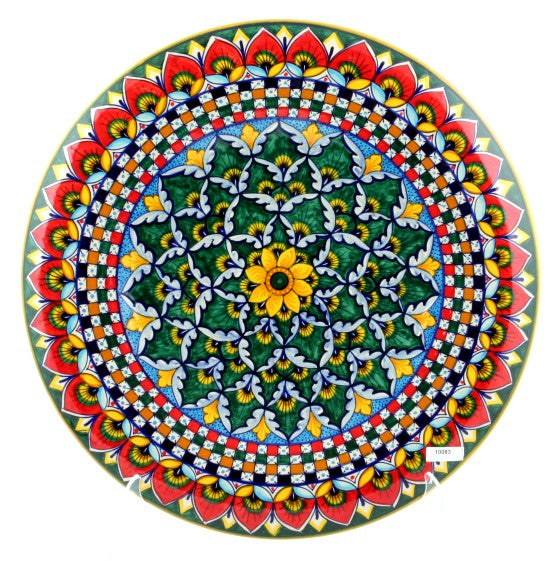 这款精美的手绘墙盘由 Geribi Deruta 制作,捕捉了意大利艺术的精髓,是色彩和设计的杰作。每个盘子都是一块独特的画布,传统技术与工匠的个人天赋相结合,将 Deruta 陶瓷的活力传承带入生活。盘子表面呈现迷人的花卉图案,以大胆的黄色、深绿色和火红色为主,所有图案都用黑色勾勒出轮廓,突出了每一个细节。令人惊叹的红色背景上点缀着精致的白点,框住了中央的黄色花朵,营造出既引人注目又和谐的效果。这件作品所展示的艺术性体现了代代相传的悠久技艺,确保每个盘子不仅是装饰珍品,也是意大利历史的一部分。这款 Geribi 作品非常适合装饰墙壁或装饰展示架,证明了手工意大利陶瓷的持久之美。