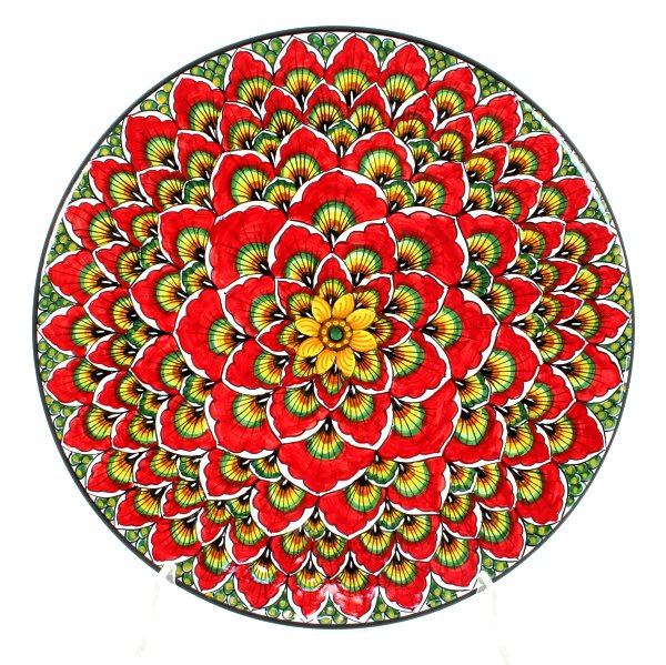 这款色彩鲜艳的手绘墙盘是意大利德鲁塔的 Geribi Studio 作品的典范。它采用郁郁葱葱的花卉图案,花瓣层层叠叠,呈鲜艳的红色和绿色,中间是一朵金黄色的花朵。复杂的图案让人联想到盛开的菊花,象征着完美和乐观。每一笔都体现了对传统工艺的承诺,将意大利艺术的乐趣带入任何空间。这块盘子不仅是一个实用物品,更是一件颂扬手工传统之美的艺术品。