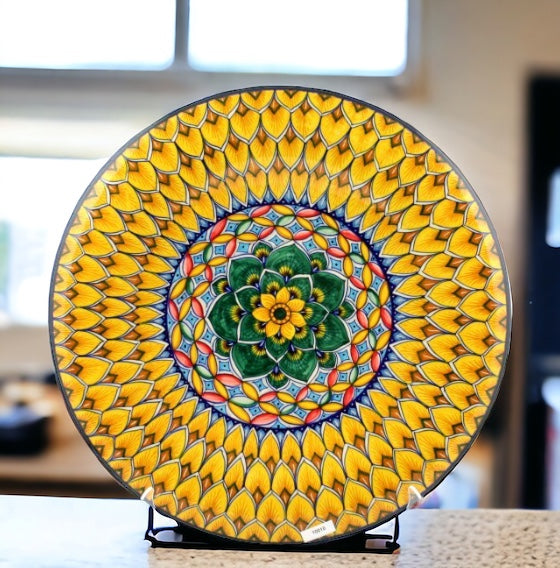 这款色彩鲜艳的手绘墙盘是意大利德鲁塔的 Geribi Studio 作品的典范。它采用郁郁葱葱的花卉图案,花瓣层层叠叠,呈鲜艳的红色和绿色,中间是一朵金黄色的花朵。复杂的图案让人想起盛开的菊花,象征着完美和乐观。每一笔都体现了对传统工艺的承诺,将意大利艺术的乐趣带入任何空间。这块盘子不仅是一个实用物品,更是一件颂扬手工传统之美的艺术品。