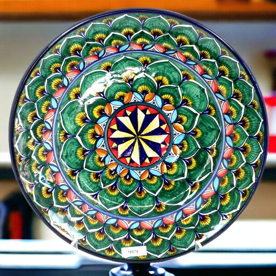 这款色彩鲜艳的手绘墙盘是意大利德鲁塔的 Geribi Studio 作品的典范。它采用郁郁葱葱的花卉图案,花瓣层层叠叠,呈鲜艳的红色和绿色,中间是一朵金黄色的花朵。复杂的图案让人联想到盛开的菊花,象征着完美和乐观。每一笔都体现了对传统工艺的承诺,将意大利艺术的乐趣带入任何空间。这块盘子不仅是一个实用物品,更是一件颂扬手工传统之美的艺术品。